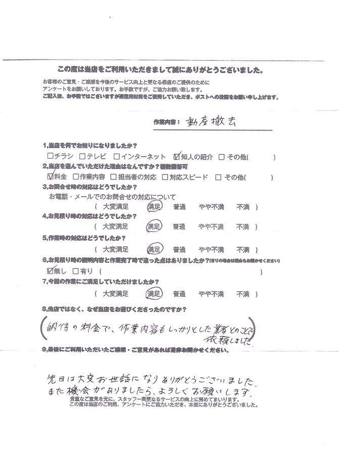 60代女性:不用品回収長い間空き家になっていた実家の不要品回収を依頼しました。3社の見積で正直一番安くはなかったのですが、電話から見積まで人柄が素晴らしかった御社にお願いしました。昔ながらの人間だったのでたくさんの荷物があり大変だったと思いますがありがとうございました。
